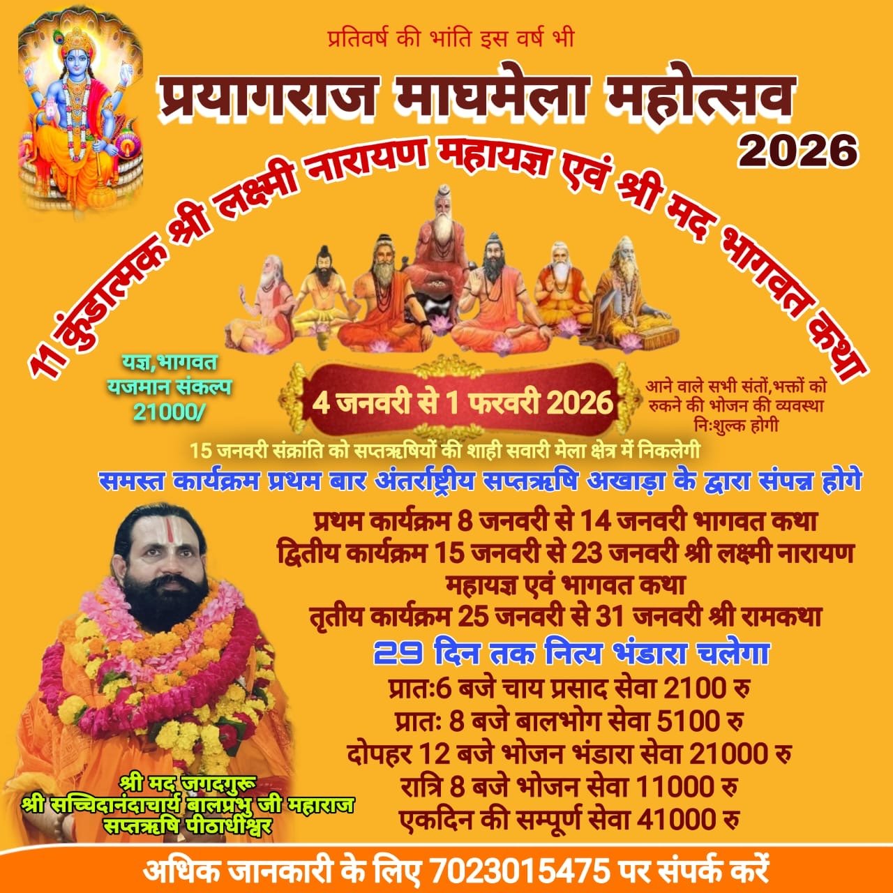 3 जनवरी से 1 फ़रवरी तक अखाड़े का कैम्प मेला क्षेत्र में लगाया जायेगा जिसमें हजारों साधु संतो को भोजन प्रसादी की व्यवस्था की जायेगी एवं अनेक संतो का महामंडलेश्वर, मंडलेश्वर ,महंत आदि पद के लिए पट्टाभिषेक का कार्यक्रम भी सम्पन्न होगा